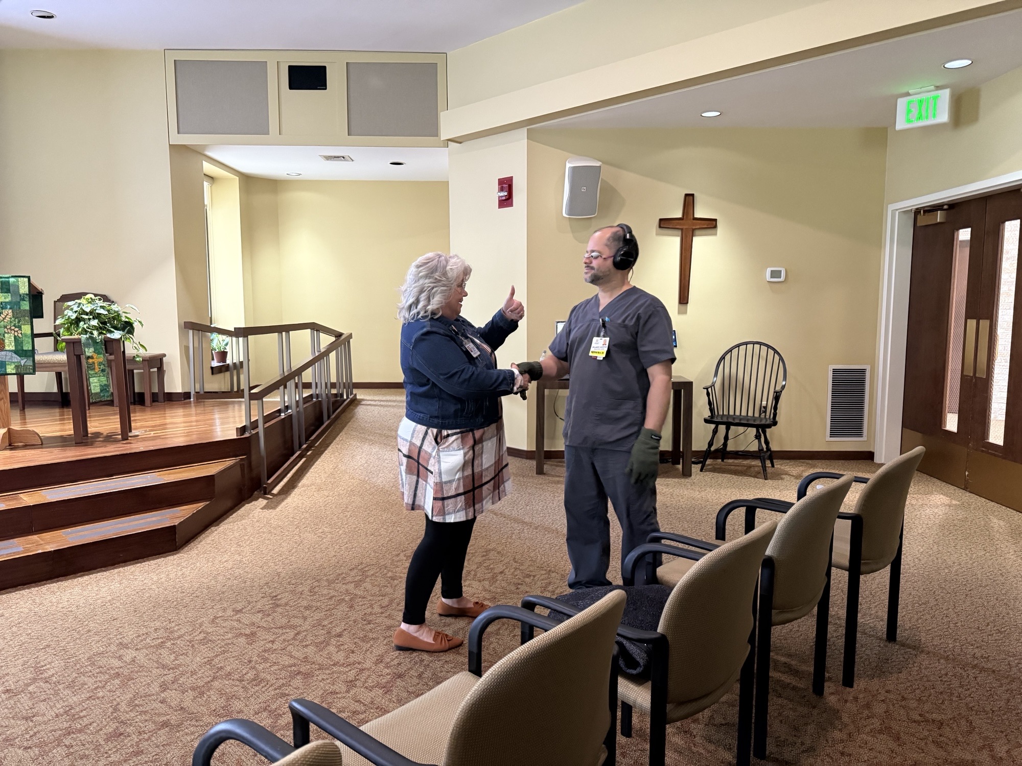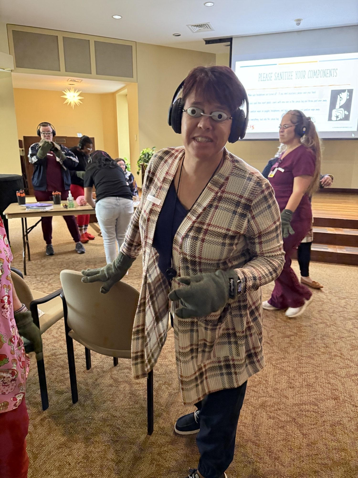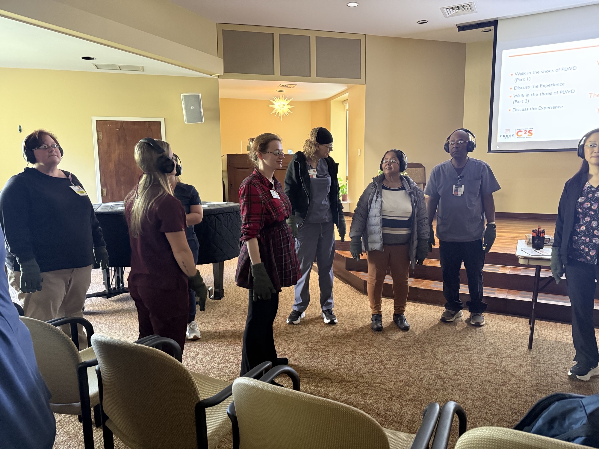 Attendees then participated in two similar experiences, with one key difference between them—though that difference would not be revealed until later. Team members were given a moment to glance around the room, noticing a few sensory stations set up. Tool kits were handed out containing goggles, headphones, spiked shoe inserts, and oversized gloves. After putting them on, team members were left to navigate the room and attempt various tasks with little to no direction. The goggles restricted vision to a dime-sized window, the headphones delivered loud and unpredictable noise, the gloves made it nearly impossible to grasp items, and the inserts made every step uncomfortable. For approximately 10 minutes, the training participants moved through that environment, experiencing the sensory and cognitive overwhelm that many individuals with Dementia face daily.